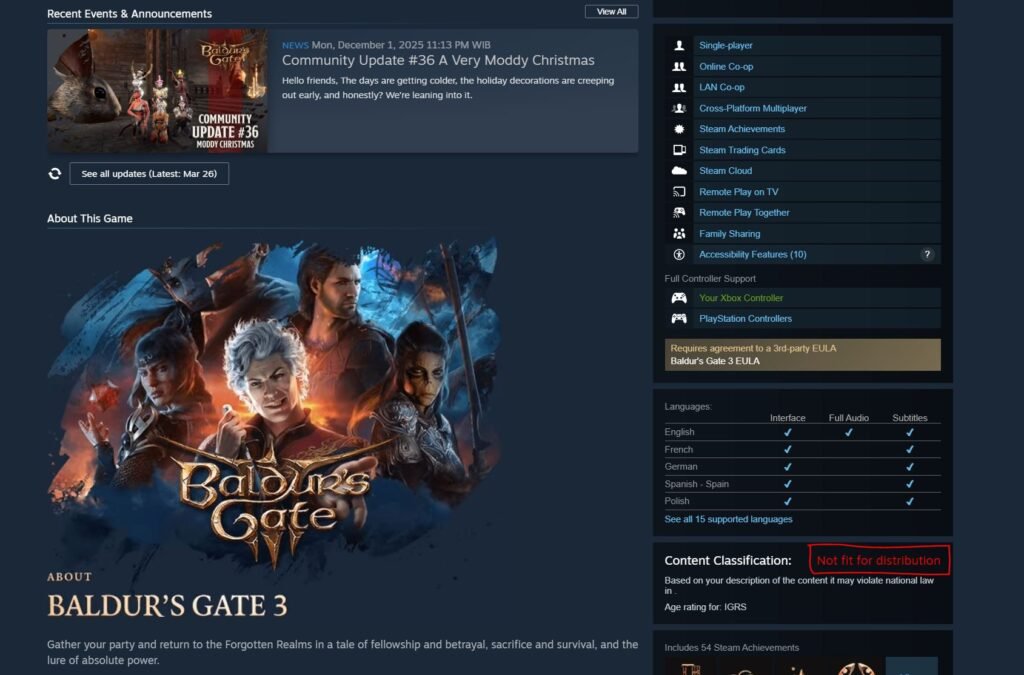 Setidaknya delapan game besar di Steam terdampak oleh label tersebut. Beberapa di antaranya termasuk Grand Theft Auto V, Baldur’s Gate 3, Clair Obscur: Expedition 33, hingga Metal Gear Solid Delta. Status ini membuat game-game tersebut berpotensi diblokir dari akses pengguna di Indonesia.